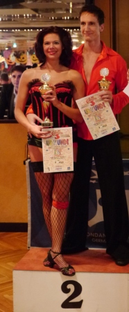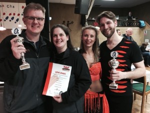 Ebenfalls in der B-Klasse startete das Paar Björn Graßl und Wiebke Rausch, welche nach einer längeren "Baby-Pause" kurz entschossen dieses Turnier mittanzen wollten. Trotz der längeren Pause konnten sie ihre Klasse von damals abrufen und holten in der B-Klasse den 2. Platz. Mit dieser Platzierung hatten Björn und Wiebke die nötigen Punkte und Platzierungen für den Aufstieg in die A-Klasse in der Tasche. (Foto: Björn und Wiebke nach der Siegerehrung unten rechts) |